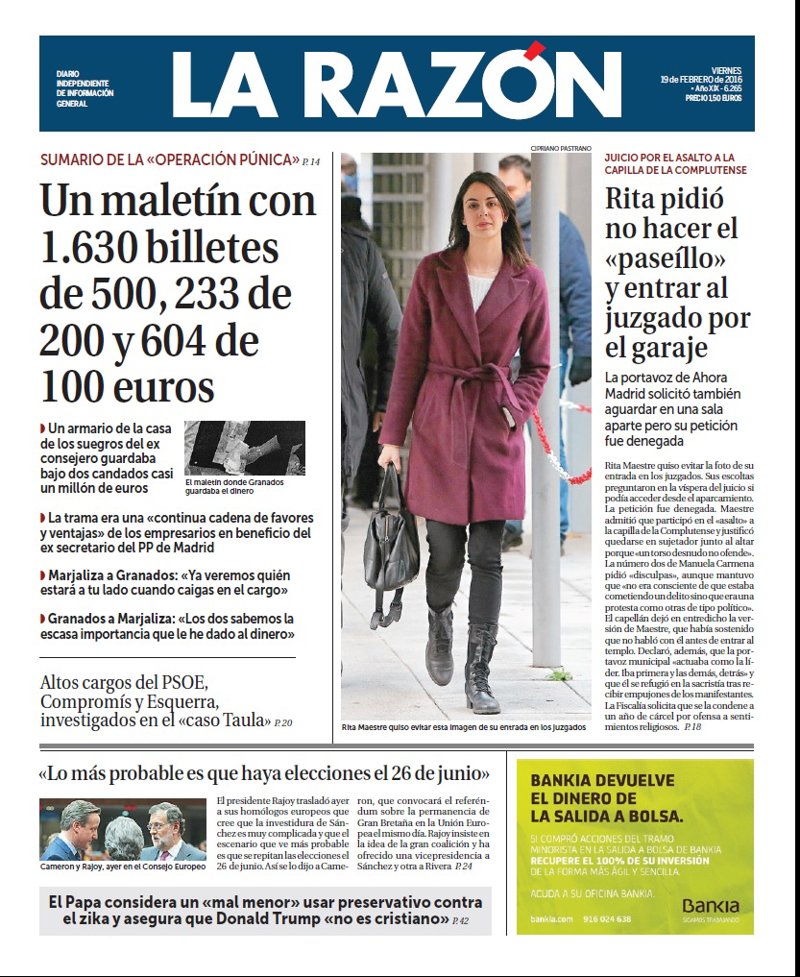LA RAZÓN: "Sumario de la Operación Púnica: Un maletín con 1.630 billetes de 500, 233 de 200 y 604 de 100 euros"; "Rita Maestre pidió no hacer el paseíllo y entrar al juzgado por el garaje. La portavoz de Ahora Madrid solicitó también aguardar en una sala aparte pero su petición fue denegada"; "El Papa considera un 'mal menor' usar preservativo contra el zika y asegura que Donald Trump 'no es cristiano".