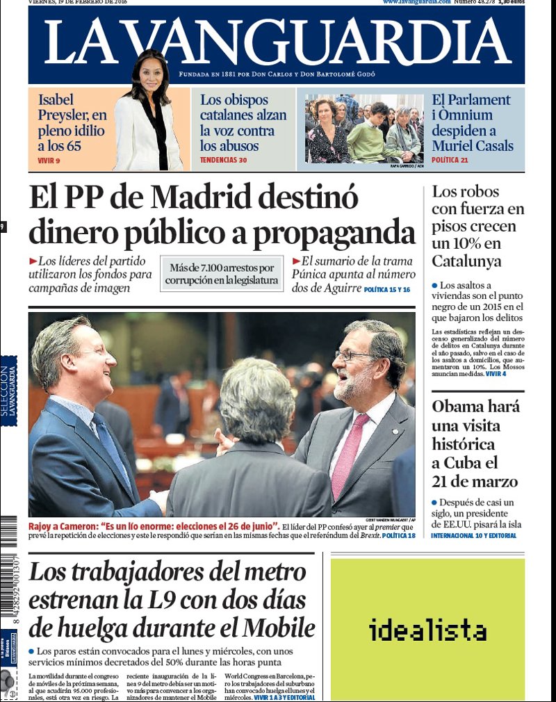 LA VANGUARDIA: "El PP de Madrid destinó dinero público a propaganda"; "Los trabajadores del metro estrenan la L9 con dos días de huelga durante el Mobile"; "Los robos con fuerza en pisos crecen un 10% en Catalunya"; "Obama hará una visita histórica a Cuba el 21 de marzo"; "El Parlament i Òmnium despiden a Muriel Casals".