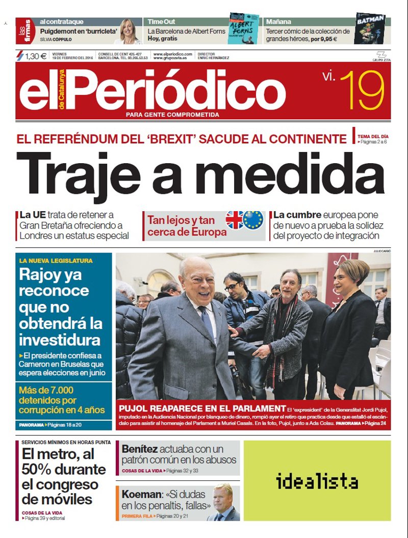 EL PERIÓDICO: "Traje a medida, el referéndum del 'Brexit' sacude al continente"; "Rajoy ya reconoce que no obtendrá la investidura"; "Pujol reaparece en el Parlament"; "El metro, al 50% durante el congreso de móviles".
