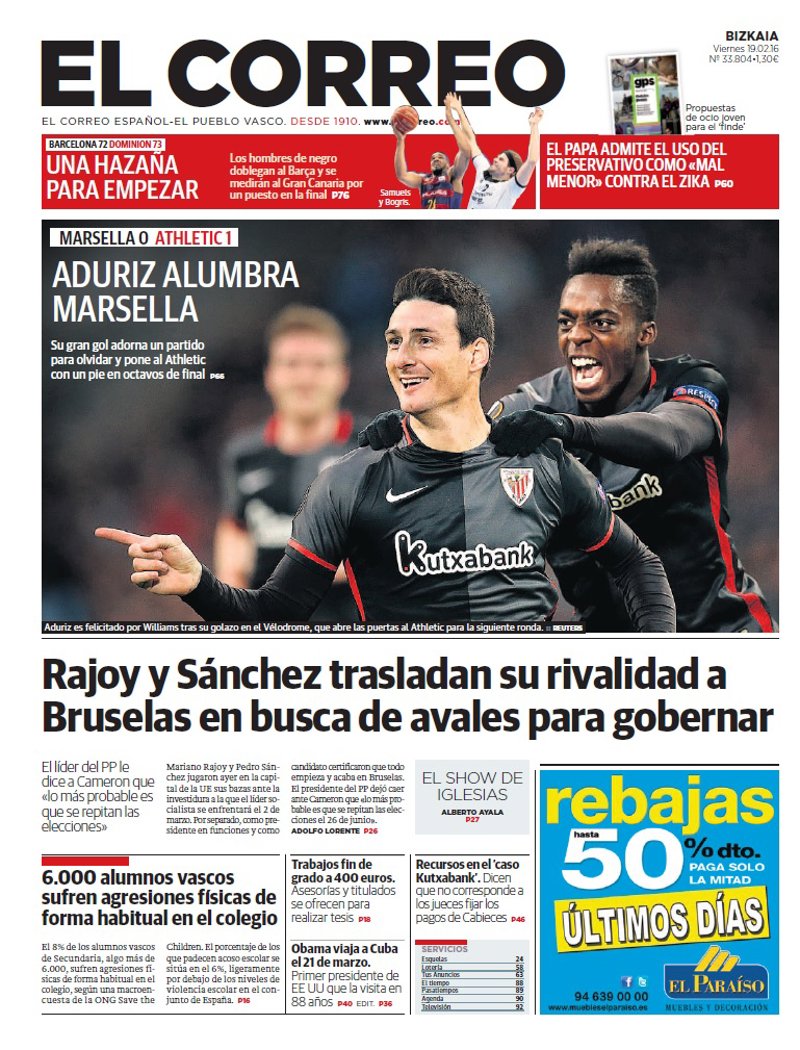 EL CORREO: "Rajoy y Sánchez trasladan su rivalidad a Bruselas en busca de avales para gobernar"; "6.000 alumnos vascos sufren agresiones físicas de forma habitual en el colegio"; "Aduriz alumbra Marsella: Su gran gol adorna un partido para olvidar y pone al Athletic con un pie en octavos de final".