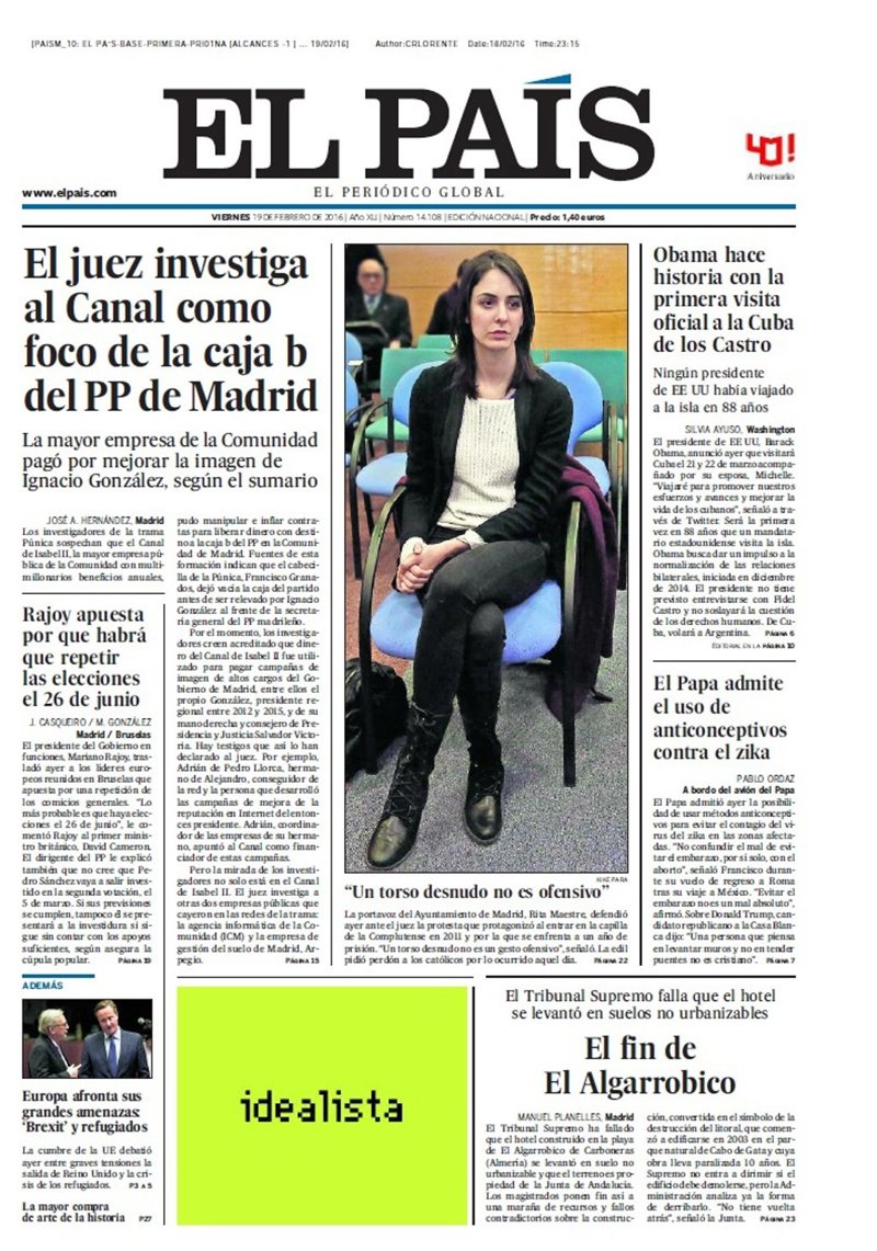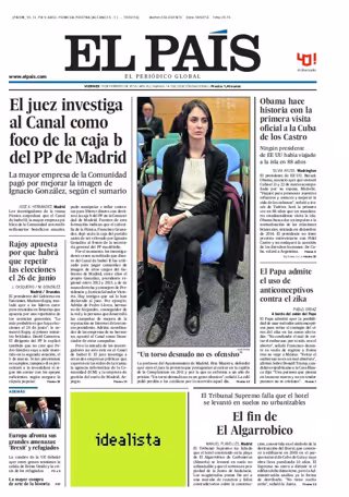 EL PAÍS: "El juez investiga al Canal como foco de la caja b del PP de Madrid. La mayor empresa de la Comunidad pagó por mejorar la imagen de Ignacio González, según el sumario"; "Obama hace historia con la primera visita oficial a la Cuba de los Castro"; "El fin de El Algarrobico. El Tribunal Supremo falla que el hotel se levantó en suelos no urbanizables"; "Rajoy apuesta por que habrá que repetir las elecciones el 26 de junio".