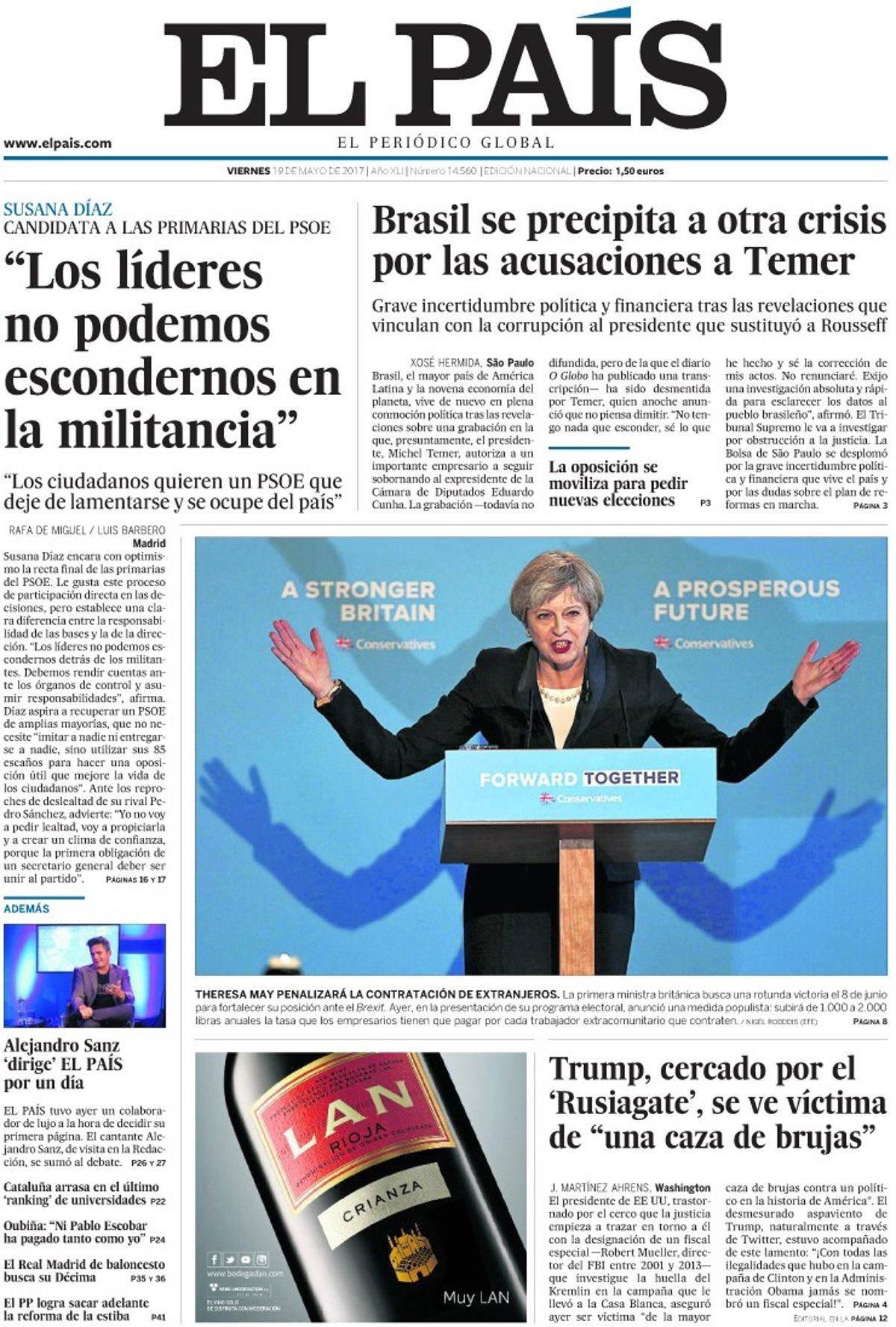 EL PAÍS: "Susana Díaz: "Los líderes no podemos escondernos en la militancia"; "Brasil se precipita a otra crisis por las acusaciones a Temer"; "Trump, cercado por el 'Rusiagate', se ve víctima de "una caza de brujas"; "Theresa May penalizará la contratación de extranjeros".