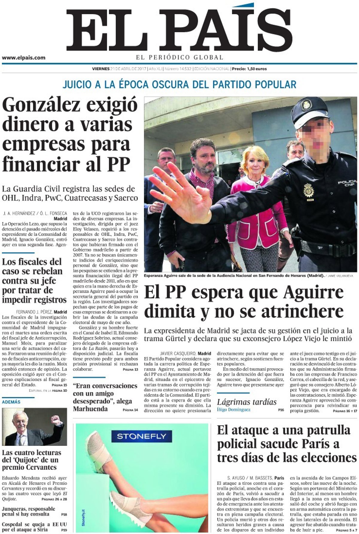 EL PAÍS: "González exigió dinero a varias empresas para financiar al PP"; "Los fiscales del caso se rebelan contra su jefe por tratar de impedir registros"; "El PP espera que Aguirre dimita y no se atrinchere"; "El ataque a una patrulla policial sacude París a tres días de las elecciones".