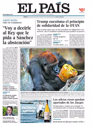 EL PAÍS: "Albert Rivera, líder de Ciudadanos: "Voy a decirle al Rey que le pida a Sánchez la abstención""; "Trump cuestiona el principio de solidaridad de la OTAN"; "Helados para los animales, una extraordinaria experiencia en el Zoo de Valencia"; "Los atletas rusos quedan apartados de los Juegos"; "Madrid estudiará cambiar el nombre a 25 calles franquistas"; "El Tribunal de Cuentas asegura que 30.000 muertos 'cobran' pensión".