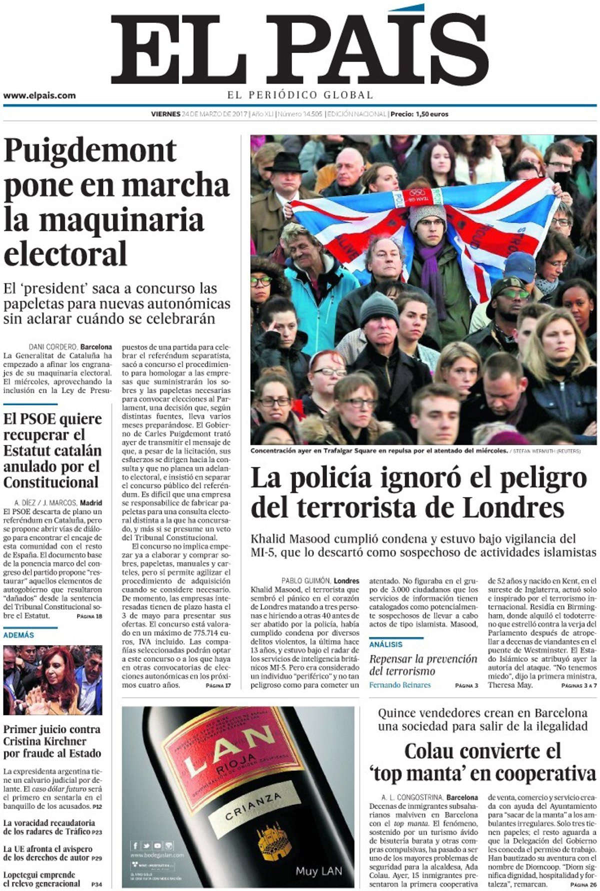EL PAÍS: "Puigdemont pone en marcha la maquinaria electoral"; "La policía ignoró el peligro del terrorista de Londres"; "Colau convierte el 'top manta' en cooperativa"; "El PSOE quiere recuperar el Estatut catalán anulado por el Constitucional"; "Primer juicio contra Cristina Kirchner por fraude al Estado".