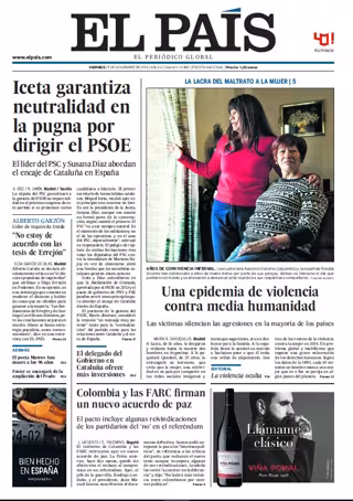 EL PAÍS: "Iceta garantiza neutralidad en la pugna por dirigir el PSOE"; "Una epidemia de violencia contra media humanidad. Las víctimas silencian las agresiones en la mayoría de los países"; "Colombia y las FARC firman un nuevo acuerdo de paz"; "El delegado del Gobierno en Cataluña ofrece más inversiones"; "Alberto Garzón, líder de Izquierda Unida: "No estoy de acuerdo con las tesis de Errejón"".