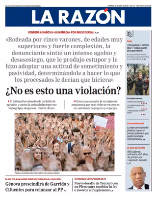 LA RAZÓN: "¿No es esto una violación?"; "Condena a 9 años a 'La Manada' por abuso sexual"; "Génova prescindirá de Garrido y Cifuentes para relanzar al PP"; "Nuevo desafío de Torrent con un Pleno para cambiar la ley e investir a Puigdemont".