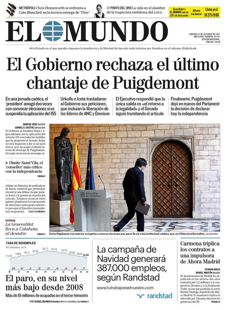 EL MUNDO: "El Gobierno rechaza el último chantaje de Puigdemont. En una jornada caótica, el 'president' amagó dos veces con convocar elecciones si se suspendía la aplicación del 155"; "Dimite Santi Vila, el 'conseller' más crítico con la independencia".