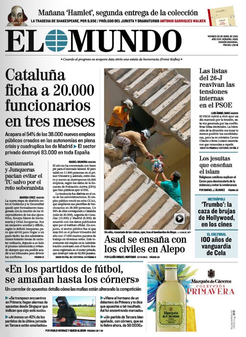 EL MUNDO: "Cataluña ficha a 20.000 funcionarios en tres meses"; "Asad se ensaña con los civiles en Alepo"; "Las listas del 26-J reavivan las tensiones internas en el PSOE".