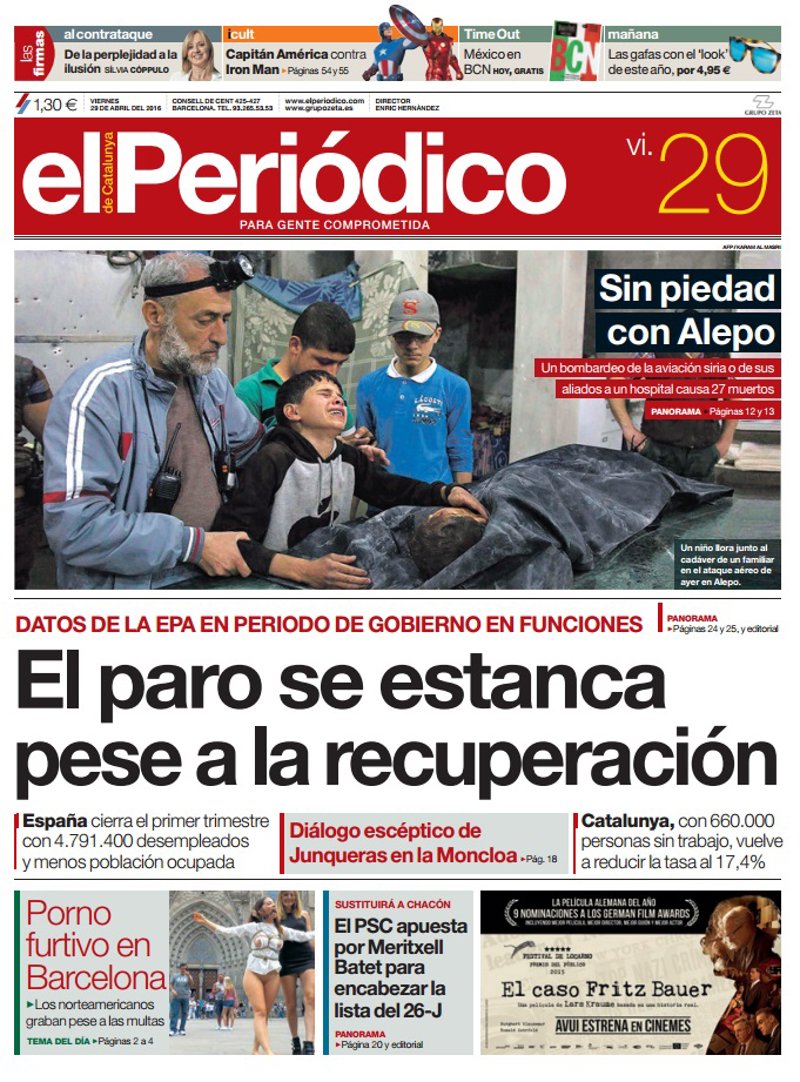 EL PERIÓDICO: "El paro se estanca pese a la recuperación"; "Diálogo escéptico de Junqueras en la Moncloa"; "El PSC apuesta por Meritxell Batet para encabezar la lista del 26-J"; "Sin piedad con Alepo", "Porno furtivo en Barcelona".