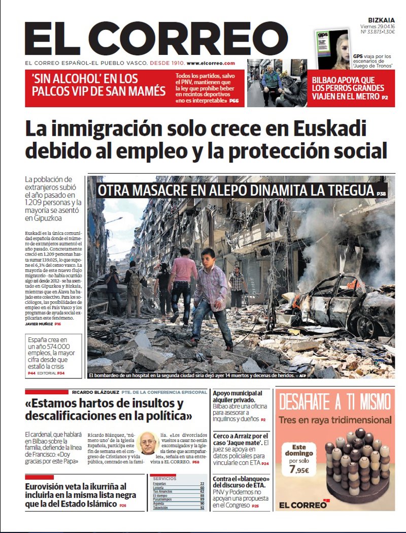 EL CORREO: "La inmigración solo crece en Euskadi debido al empleo y la protección social"; "Otra masacre en Alepo dinamita la tregua"; "Ricardo Blázquez, presidente de la Conferencia Episcopal: "Estamos hartos de insultos y descalificaciones en la política""; "Eurovisión veta la ikurriña al incluirla en la misma lista negra que la del Estado Islámico".
