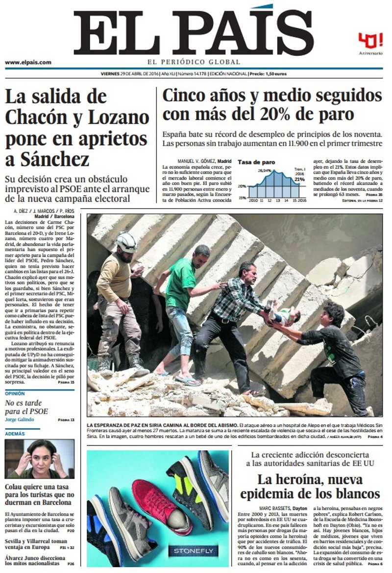 EL PAÍS: "La salida de Chacón y Lozano pone en aprietos a Sánchez"; "Cinco años y medio seguidos con más del 20% de paro"; "La creciente adicción desconcierta a las autoridades sanitarias de EE UU: La heroína, nueva epidemia de los blancos".