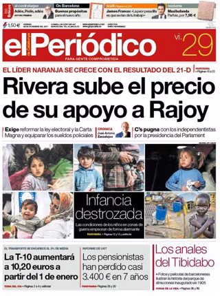 EL PERIÓDICO: "Rivera sube el precio de su apoyo a Rajoy"; "Infancia destrozada. Las condiciones de los niños en zonas de guerra empeoran de forma alarmante"; "La T-10 aumentará a 10,20 euros a partir del 1 de enero"; "Los pensionistas han perdido casi 3.400 euros en siete años".