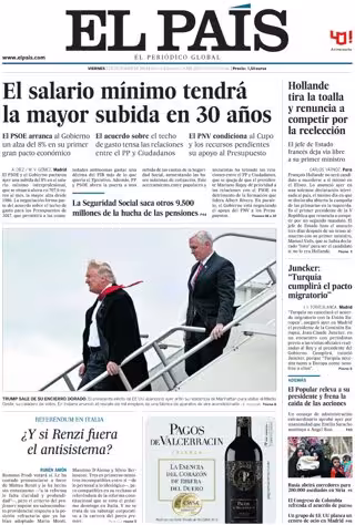EL PAÍS: "El salario mínimo tendrá la mayor subida en 30 años"; "La Seguridad Social saca otros 9.500 millones de la hucha de las pensiones"; "Hollande tira la toalla y renuncia a competir por la reelección"; "Juncker: "Turquía cumplirá el pacto migratorio"; "El Popular releva a su presidente y frena la caída de las acciones".