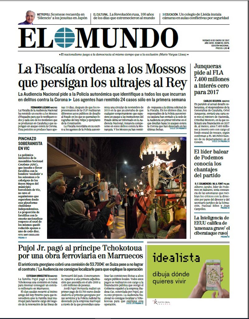 EL MUNDO: "La Fiscalía ordena a los Mossos que persigan los ultrajes al Rey"; "Pinchazo soberanista en Vic"; "Pujol Jr. pagó al príncipe Tchokotoua por una obra ferroviaria en Marruecos"; "Junqueras pide al FLA 7.400 millones a interés cero para 2017"; "El líder balear de Podemos conocía los chantajes del partido"; "La Inteligencia de EEUU califica de 'amenaza grave' el ciberataque ruso".