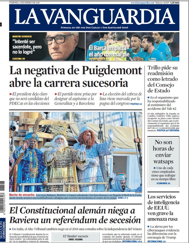 LA VANGUARDIA: "La negativa de Puigdemont abre la carrera sucesoria"; "Noche de ensueño. Los reyes Baltasar, Melchor y Gaspar saludando a los barceloneses a su llegada al Moll de la Fusta ,desde donde arrancó una multitudinaria cabalgata que recorrió sin incidentes el centro de la ciudad"; "El Constitucional alemán niega a Baviera un referéndum de secesión"; "Trillo pide su readmisión como letrado del Consejo de Estado"; "No son horas de enviar watsaps"; "Los servicios de inteligencia de EE.UU. ven grave la amenaza rusa".
