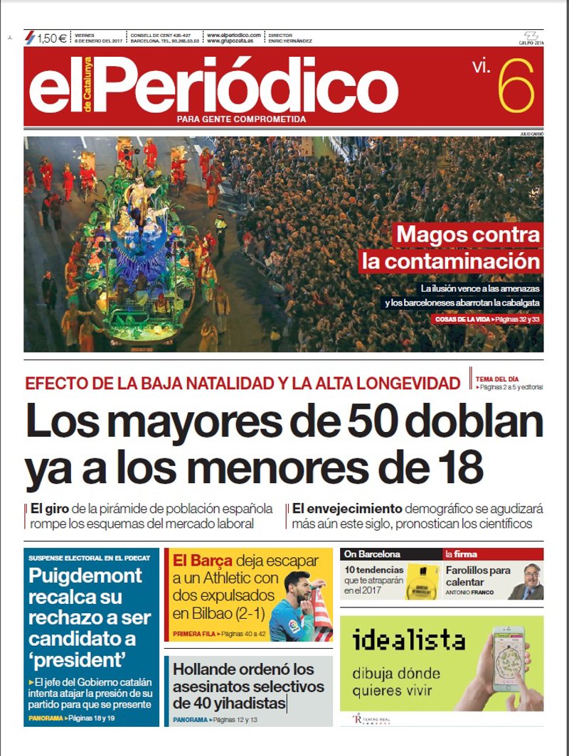 EL PERIÓDICO: "Magos contra la contaminación. La ilusión vence a las amenazas y los barceloneses abarrotan la cabalgata"; "Los mayores de 50 doblan ya a los menores de 18"; "Puigdemont recalca su rechazo a ser candidato a 'president'"; "El Barça deja escapar a un Athletic con dos expulsados en Bilbao (2-1)"; "Hollande ordenó los asesinatos selectivos de 40 yihadistas".
