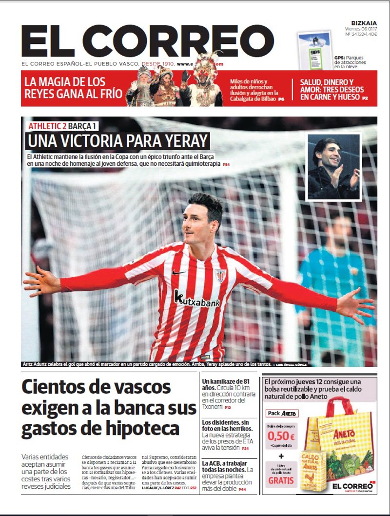 EL CORREO: "Una victoria para Yeray. El Athletic mantiene la ilusión en la Copa con un épico triunfo ante el Barça en una noche de homenaje al joven defensa, que no necesitará quimioterapia"; "Cientos de vascos exigen a la banca sus gastos de hipoteca".