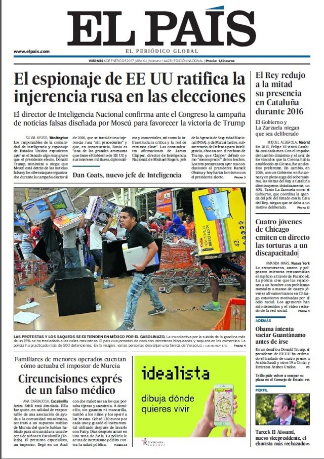 EL PAÍS: "El espionaje de EE UU ratifica la injerencia rusa en las elecciones. Dan Coats, nuevo jefe de Inteligencia"; "Las protestas y los saqueos se extienden en México por el gasolinazo"; "Circuncisiones exprés de un falso médico. Familiares de menores operados cuentan cómo actuaba el impostor de Murcia"; "El Rey redujo a la mitad su presencia en Cataluña durante 2016"; "Cuatro jóvenes de Chicago emiten en directo las torturas a un discapacitado".