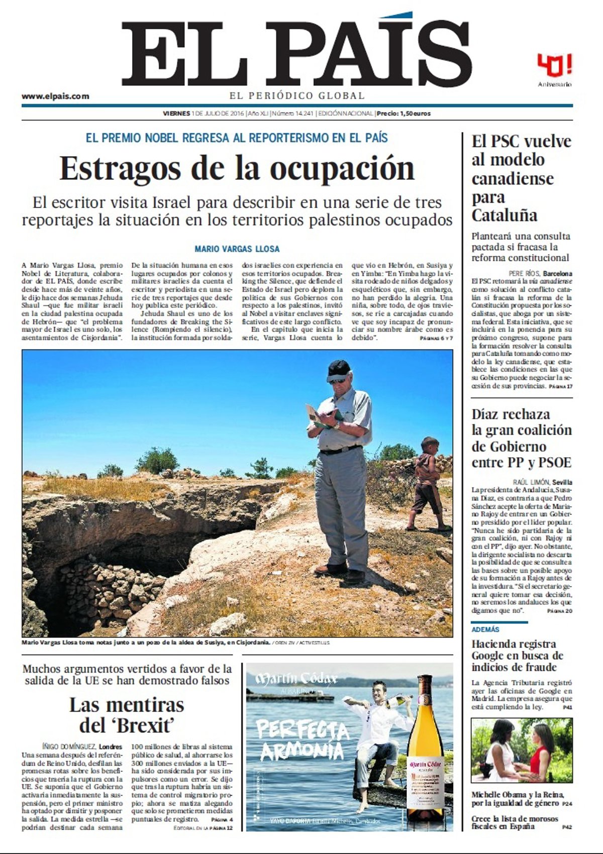 EL PAÍS: "Estragos de la ocupación (Mario Vargas Llosa). El escritor visita Israel para describir en una serie de tres reportajes la situación en los territorios palestinos ocupados"; "Las mentiras del 'Brexit'. Muchos argumentos vertidos a favor de la salida de la UE se han demostrado falsos"; "El PSC vuelve al modelo canadiense para Cataluña"; "Díaz rechaza la gran coalición de Gobierno entre PP y PSOE"; "Hacienda registra Google en busca de indicios de fraude".