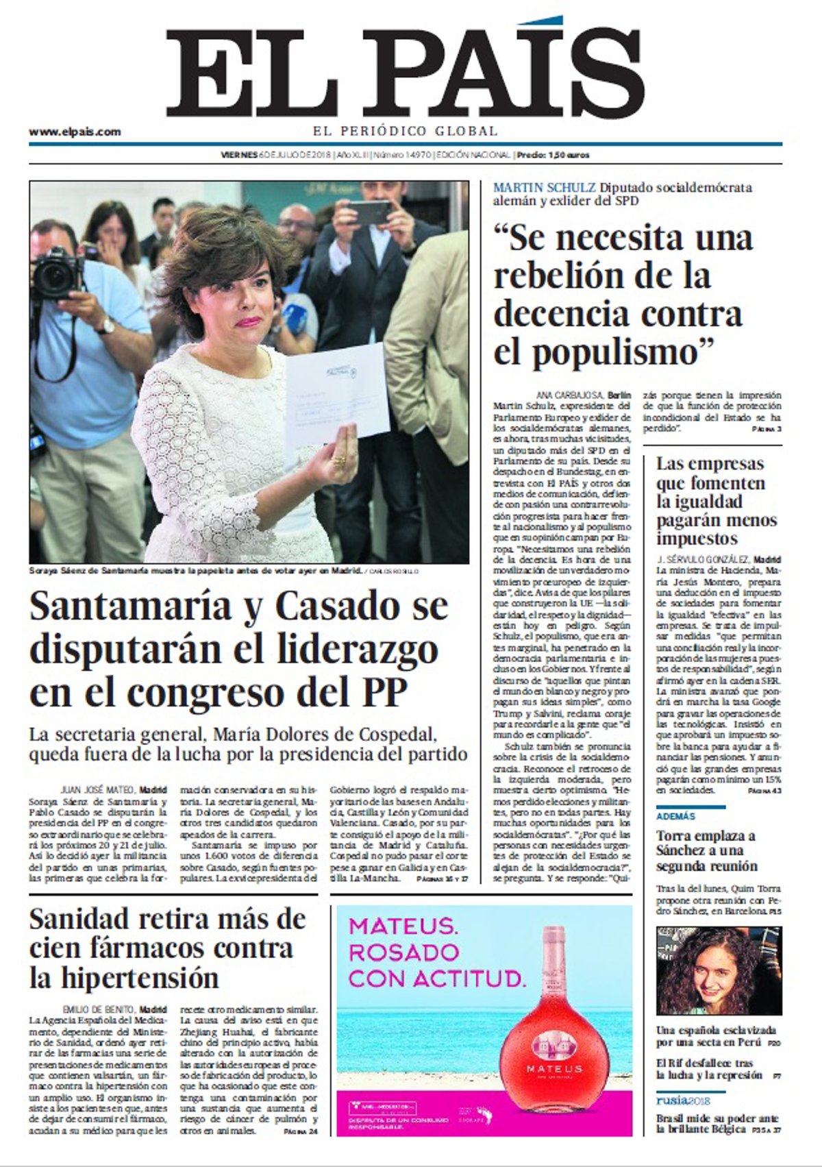 EL PAÍS: "Santamaría y Casado se disputarán el liderazgo en el congreso del PP. La secretaria general, María Dolores de Cospedal, queda fuera de la lucha por la presidencia del partido"; "Sanidad retira más de cien fármacos contra la hipertensión"; "Martin Schultz, diputado socialdemócrata alemán y exlíder del SPD: "Se necesita una rebelión de la decencia contra el populismo""; "Las empresas que fomenten la igualdad pagarán menos impuestos".