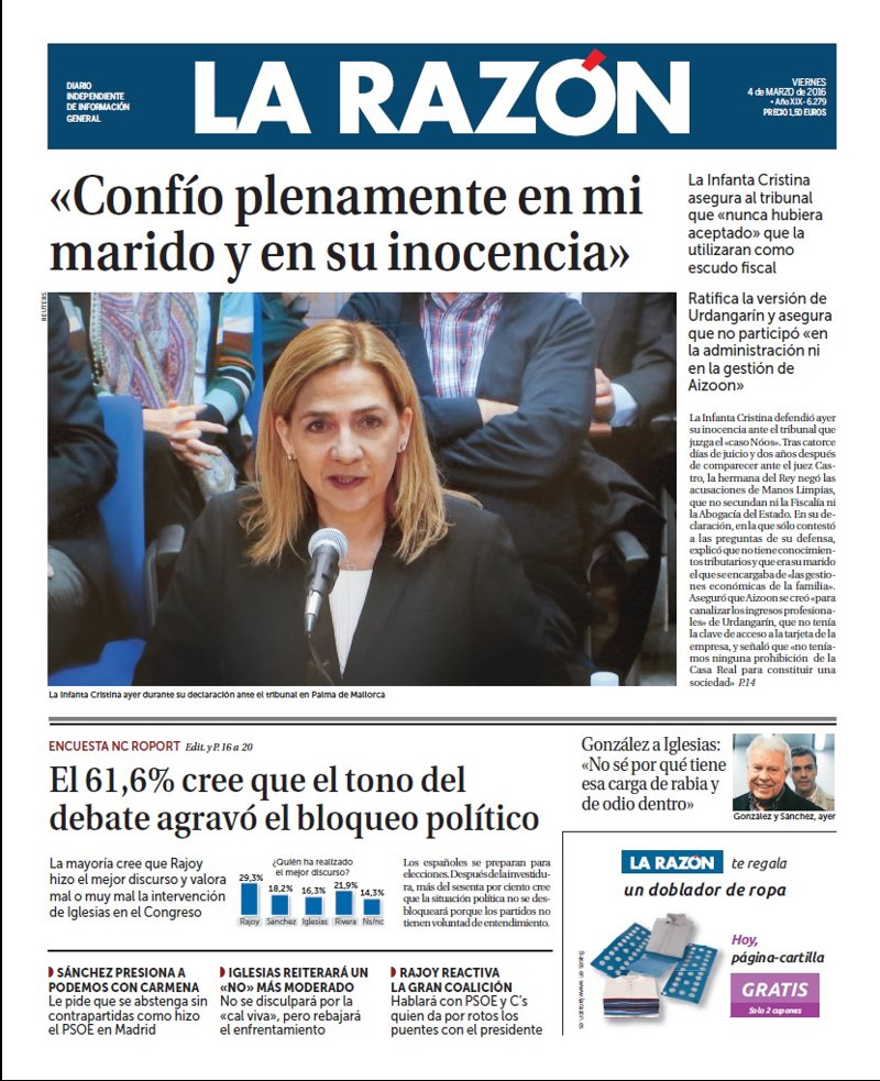 LA RAZÓN: ""Confío plenamente en mi marido y en su inocencia". La Infanta Cristina asegura al tribunal que "nunca hubiera aceptado" que la utilizaran como escudo fiscal"; "El 61,6% cree que el tono del debate agravó el bloqueo político"; "González a Iglesias: "No sé por qué tiene esa carga de rabia y de odio dentro""; "Sánchez presiona a Podemos con Carmena"; "Iglesias reiterará un "no" más moderado"; "Rajoy reactiva la gran coalición".