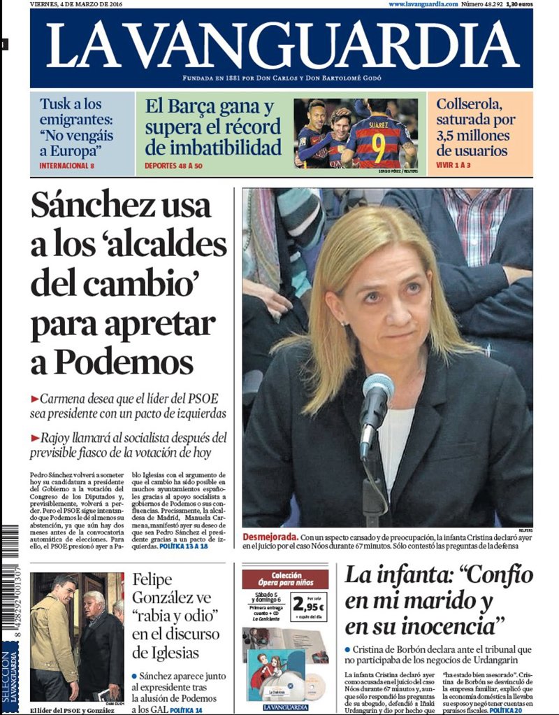 LA VANGUARDIA: "La infanta: "Confío en mi marido y en su inocencia""; "Sánchez usa a los 'alcaldes del cambio' para apretar a Podemos"; "Felipe González ve "rabia y odio" en el discurso de Iglesias".