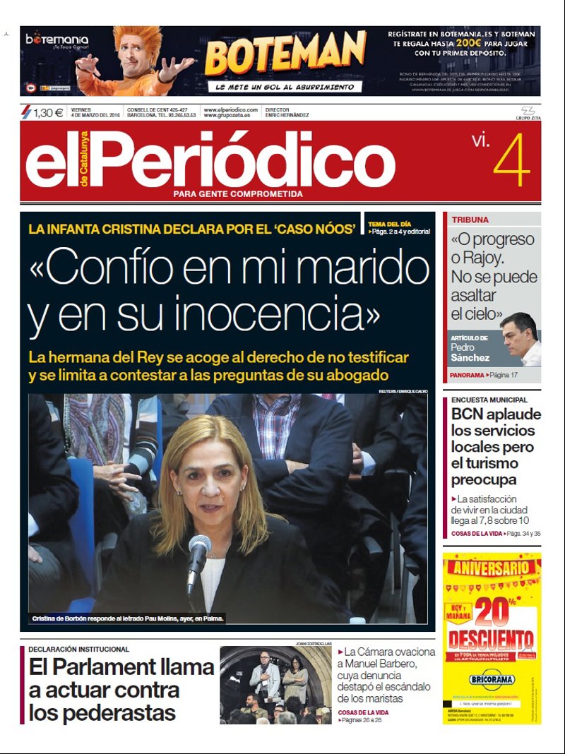 EL PERIÓDICO: "La Infanta Cristina declara por el 'caso Nóos'. "Confío en mi marido y en su inocencia". La hermana del Rey se acoge al derecho de no testificar y se limita a contestar a las preguntas de su abogado"; "El Parlament llama a actuar contra los pederastas"; "BCN aplaude los servicios locales pero el turismo preocupa".