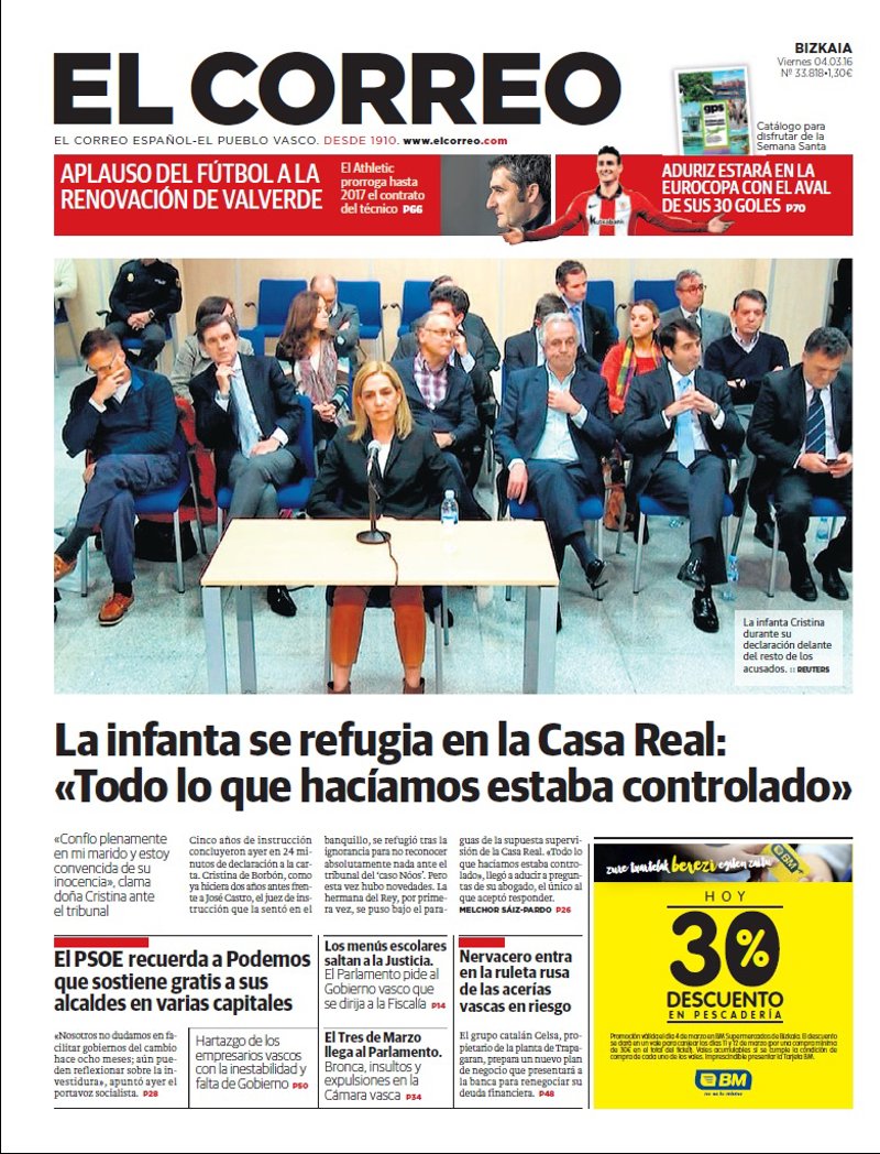 EL CORREO: "La infanta se refugia en la Casa Real: "Todo lo que hacíamos estaba controlado""; "El PSOE recuerda a Podemos que sostiene gratis a sus alcaldes en varias capitales"; "Los menús escolares saltan a la Justicia"; "El Tres de Marzo llega al Parlamento"; "Nervacero entra en la ruleta rusa de las acerías vascas en riesgo".