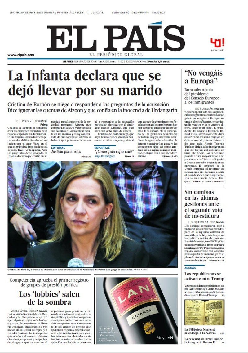 EL PAÍS: "La Infanta declara que se dejó llevar por su marido"; "Los 'lobbies' salen de la sombra. Competencia aprueba el primer registro de grupos de presión política"; ""No vengáis a Europa". Dura advertencia del presidente del Consejo Europeo a los inmigrantes"; "Sin cambios en las últimas gestiones ante el segundo voto de investidura"; "Los republicanos se activan contra Trump".