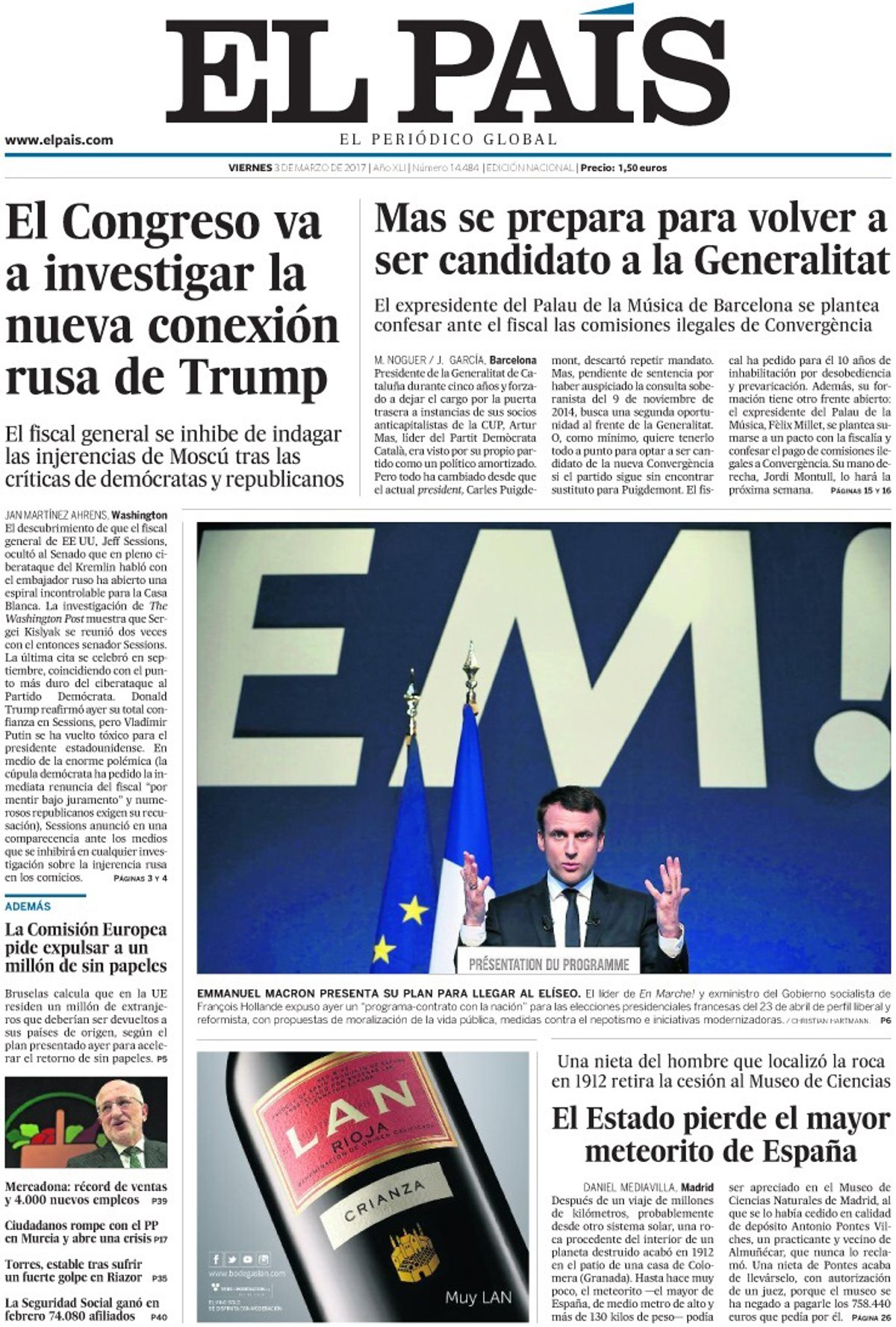 EL PAÍS: "El Congreso va a investigar la nueva conexión rusa de Trump"; "Mas se prepara para volver a ser candidato a la Generalitat"; "El Estado pierde el mayor meteorito de España"; "La Comisión Europea pide expulsar a un millón de sin papeles".