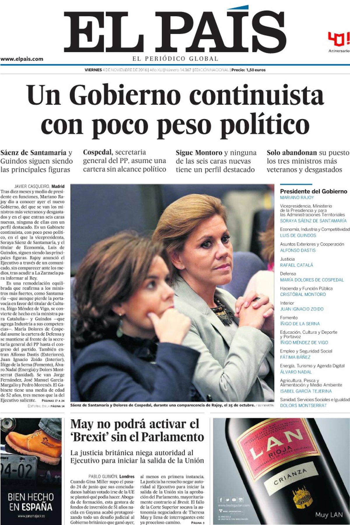 EL PAÍS: "Un Gobierno continuista con poco peso político. Sáenz de Santamaría y Guindos siguen siendo las principales figuras. Cospedal, secretaria general del PP, asume una cartera sin alcance político"; "May no podrá activar el 'Brexit' sin el Parlamento".