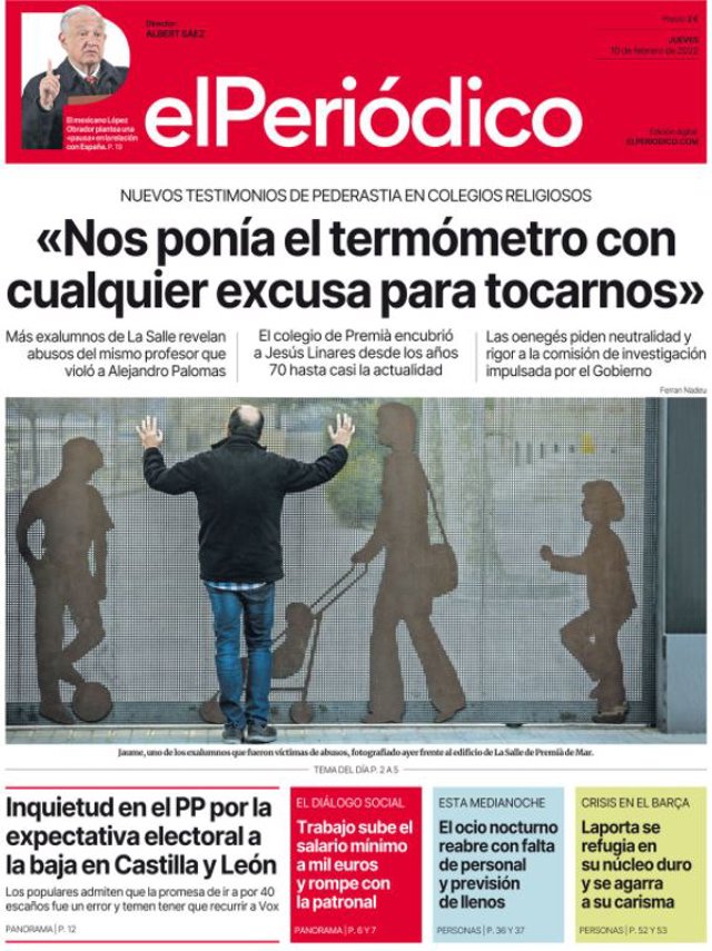 EL PERIÓDICO: "Nuevos testimonios de pederastia en colegios religiosos: "Nos ponía el termómetro con cualquier excusa para tocarnos"; "Inquietud en el PP por la expectativa electoral a la baja en Castilla y León".