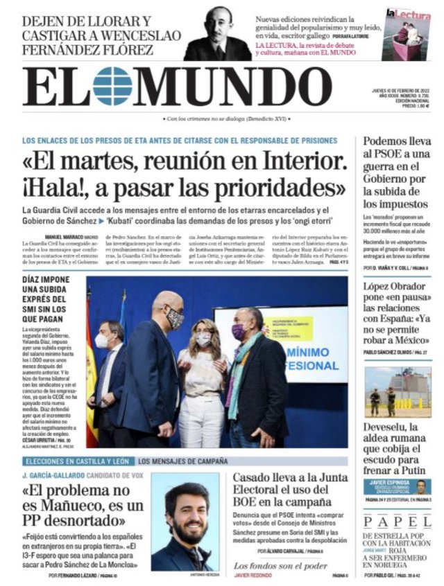 EL MUNDO: "'El martes, reunión en Interior. ¡Hala!, a pasar las prioridades'"; "Díaz impone una subida exprés del SMI sin los que pagan"; "Podemos lleva al PSOE a una guerra en el Gobierno por la subida de los impuestos"; "López Obrador pone en pausa las relaciones con España: 'Ya no se permite robar a México'"; "Deveselu, la aldea rumana que cobija el escudo para frenar a Putin"; "Entrevista a J. García Gallardo, candidato de Vox: 'El problema no es Mañueco, es un PP desnortado'".