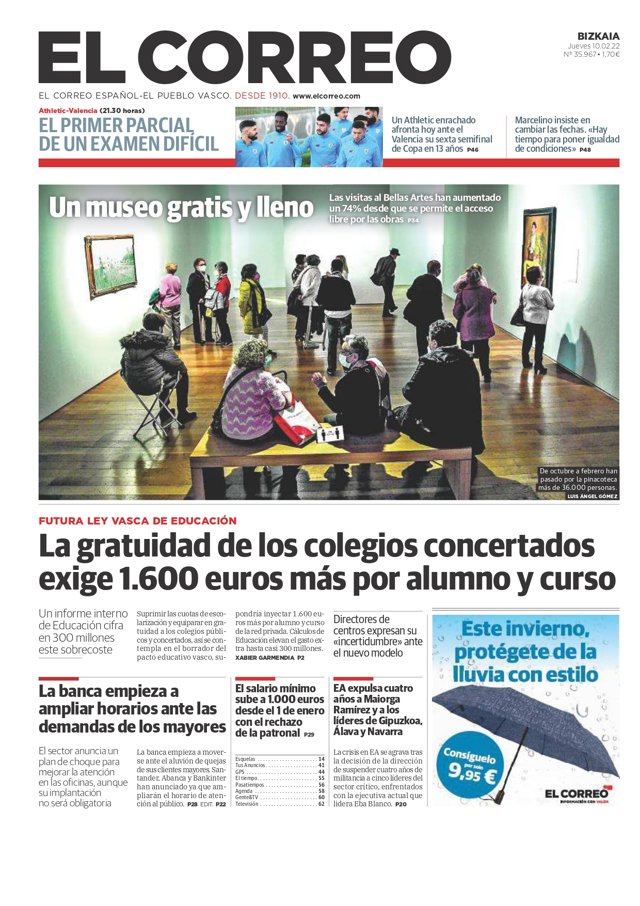 EL CORREO: "Un museo gratis y lleno"; "La gratuidad de los colegios concertados exige 1.600 euros más por alumno y curso"; "La banca empieza a ampliar horarios ante las demandas de los mayores"; "El salario mínimo sube a 1.000 euros desde el 1 de enero conel rechazo de la patronal"; "EA expulsa cuatro años a Maiorga Ramírez y a los líderes de Gipuzkoa, Álava y Navarra".
