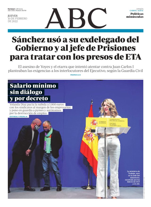 ABC: "Sánchez usó a su exdelegado del Gobierno y al jefe de Prisiones para tratar con los presos de ETA"; "Salario mínimo sin diálogo y por decreto".