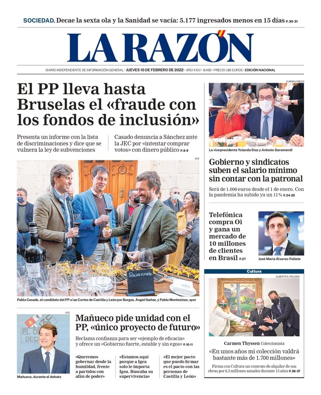 LA RAZÓN: "El PP lleva hasta Bruselas el fraude con los fondos de inclusión"; "Mañueco pide unidad con el futuro del PP, 'único proyecto de futuro'"; "Gobierno y sindicatos suben el salario mínimo sin contar con la patronal"; "Telefónica compra Oi y gana un mercado de 10 millones de clientes en Brasil".