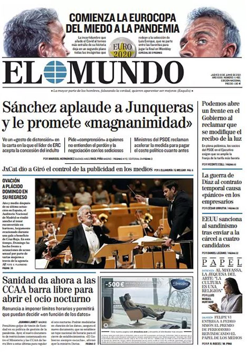 EL MUNDO: "Sánchez aplaude a Junqueras y le promete "magnanimidad""; "JxCat dio a Giró el control de la publicidad en los medios"; "Sanidad da ahora a las CCAA barra libre para abrir el ocio nocturno"; "Podemos abre un frente en el Gobierno al reclamar que se modifique el recibo de la luz"; "La guerra de Díaz al contrato temporal causa "pánico" en los empresarios"; "EEUU sanciona al sandinismo tras enviar a la cárcel a cuatro candidatos".