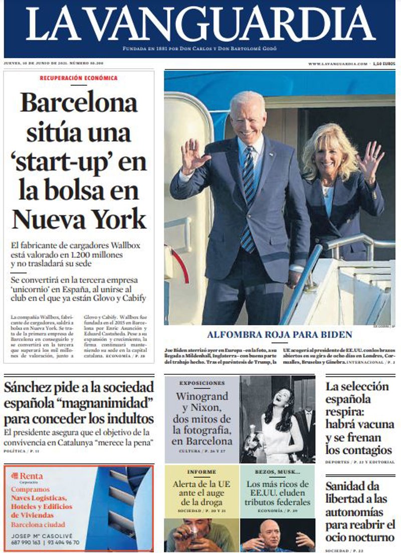 LA VANGUARDIA: "Barcelona sitúa una 'start-up' en la bolsa en Nueva York"; "Sánchez pide a la sociedad española "magnanimidad" para conceder los indultos"; "La selección española respira: habrá vacuna y se frenan los contagios"; "Sanidad da libertada las autonomías para reabrir el ocio nocturno".