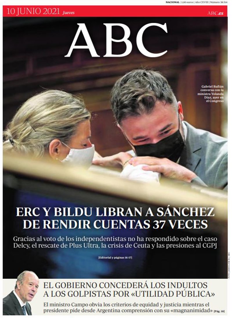 ABC: "ERC y Bildu libran a Sánchez de rendir cuentas 37 veces. Gracias al voto de los independentistas no ha respondido sobre el caso Delcy, el rescate de Plus Ultra, la crisis de Ceuta y las presiones al CGPJ"; "El Gobierno concederá los indultos a los golpistas por "utilidad pública". El ministro Campo obvia los criterios de equidad y justicia mientras el presidente pide desde Argentina comprensión con su "magnanimidad"".