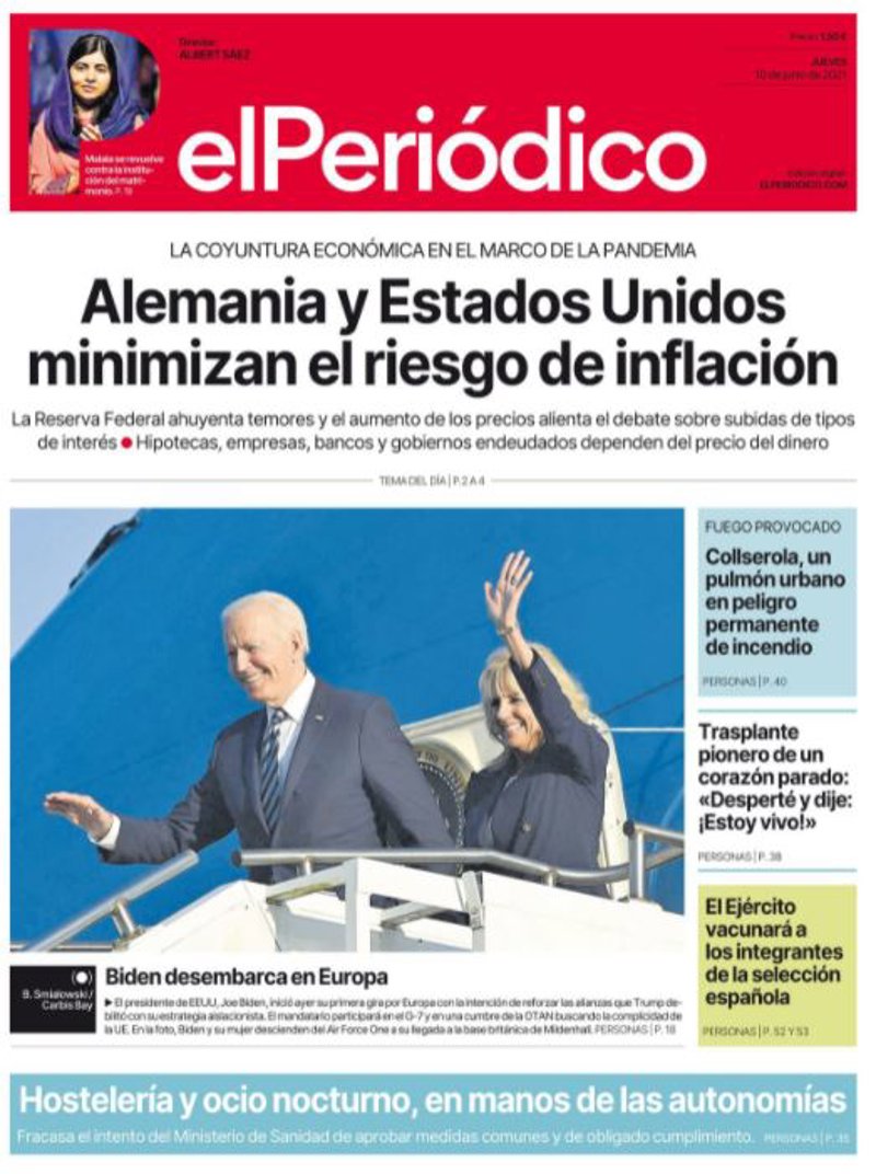 EL PERIÓDICO: "Alemania y Estados Unidos minimizan el riesgo de inflación"; "Hostelería y ocio nocturno, en manos de las autonomías"; "Collserola, un pulmón urbano en peligro permanente de incendio"; "Trasplante pionero de un corazón parado: "Desperté y dije: ¡Estoy vivo!""; "El Ejército vacunará a los integrantes de la selección española".