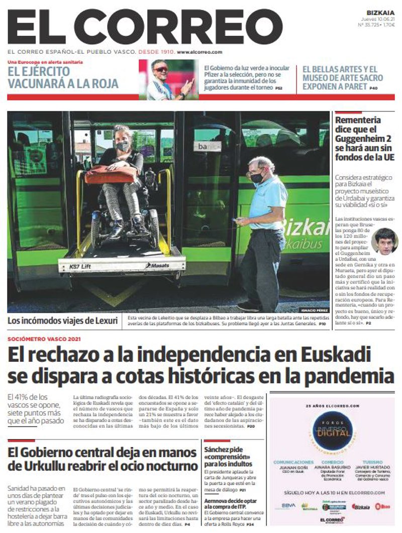 EL CORREO: "El rechazo a la independencia en Euskadi se dispara a cotas históricas en la pandemia"; "El Gobierno central deja en manos de Urkullu reabrir el ocio nocturno"; "Sánchez pide "comprensión" para los indultos"; "Aernnova decide optar a la compra de ITP"; "Rementeria dice que el Guggenheim 2 se hará aun sin fondos de la UE".