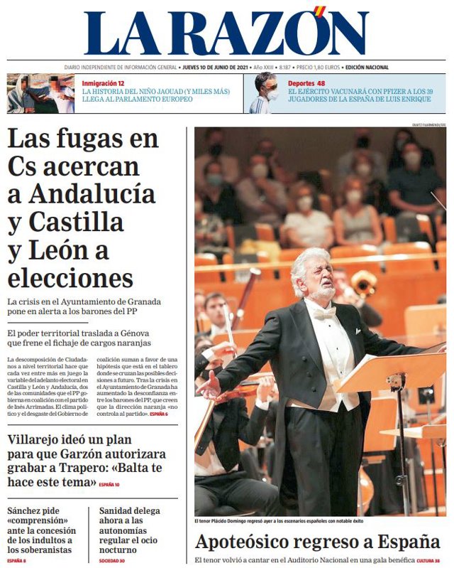 elecciones"; "Villarejo ideó un plan para que Garzón autorizara grabar a Trapero: "Balta te hace este tema""; "Sánchez pide "comprensión" ante la concesión de los indultos a los soberanistas"; "Sanidad delega ahora a las autonomías regular el ocio nocturno"; "Apoteósico regreso a España".