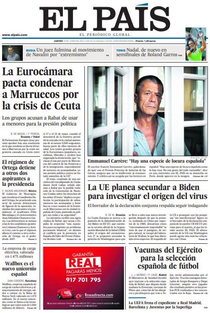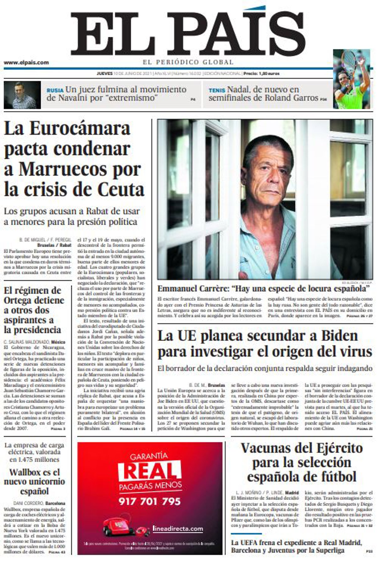 EL PAÍS: "La Eurocámara pacta condenar a Marruecos por la crisis de Ceuta"; "El régimen de Ortega detiene a otros dos aspirantes a la presidencia"; "Wallbox es el nuevo unicornio español. La empresa de carga eléctrica, valorada en 1.475 millones"; "Emmanuel Carrère: "Hay una especie de locura española""; "La UE planea secundar a Biden para investigar el origen del virus"; "Vacunas del Ejército para la selección española de fútbol".