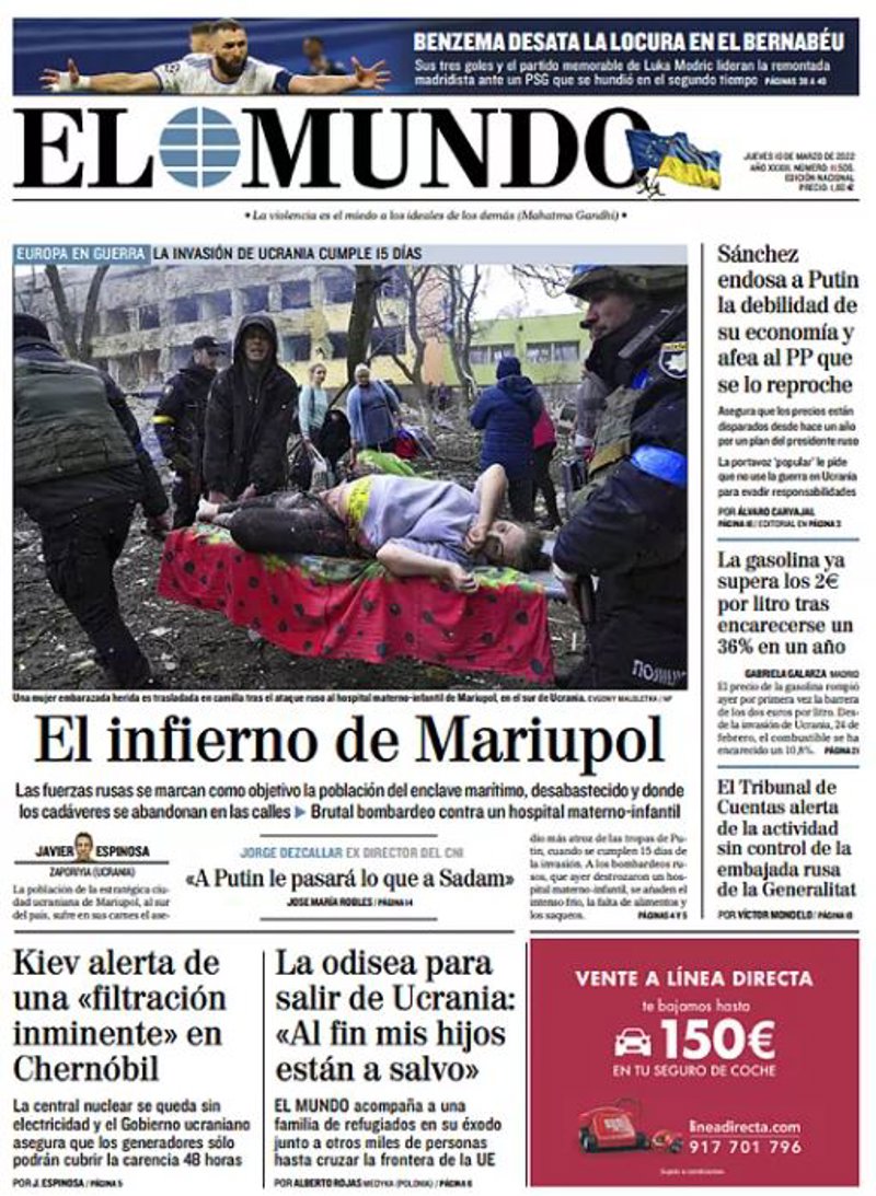 EL MUNDO: "El infierno de Mariupol"; "Kiev alerta de una "filtración inminente" en Chernóbil"; "La odisea para salir de Ucrania: "Al fin mis hijos están a salvo""; "Sánchez endosa a Putin la debilidad de la economía y afea al PP que se lo reproche"; "La gasolina ya supera los 2€ por litro tras encarecerse un 36% en un año"; "El Tribunal de Cuentas alerta de la actividad sin control de la embajada rusa de la Generalitat".