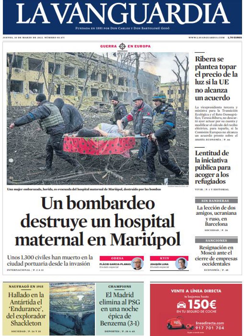 LA VANGUARDIA: "Un bombardeo destruye un hospital maternal en Mariúpol"; "Ribera se plantea topar el precio de la luz si la UE no alcanza un acuerdo"; "Lentitud de la iniciativa pública para acogeralos refugiados".