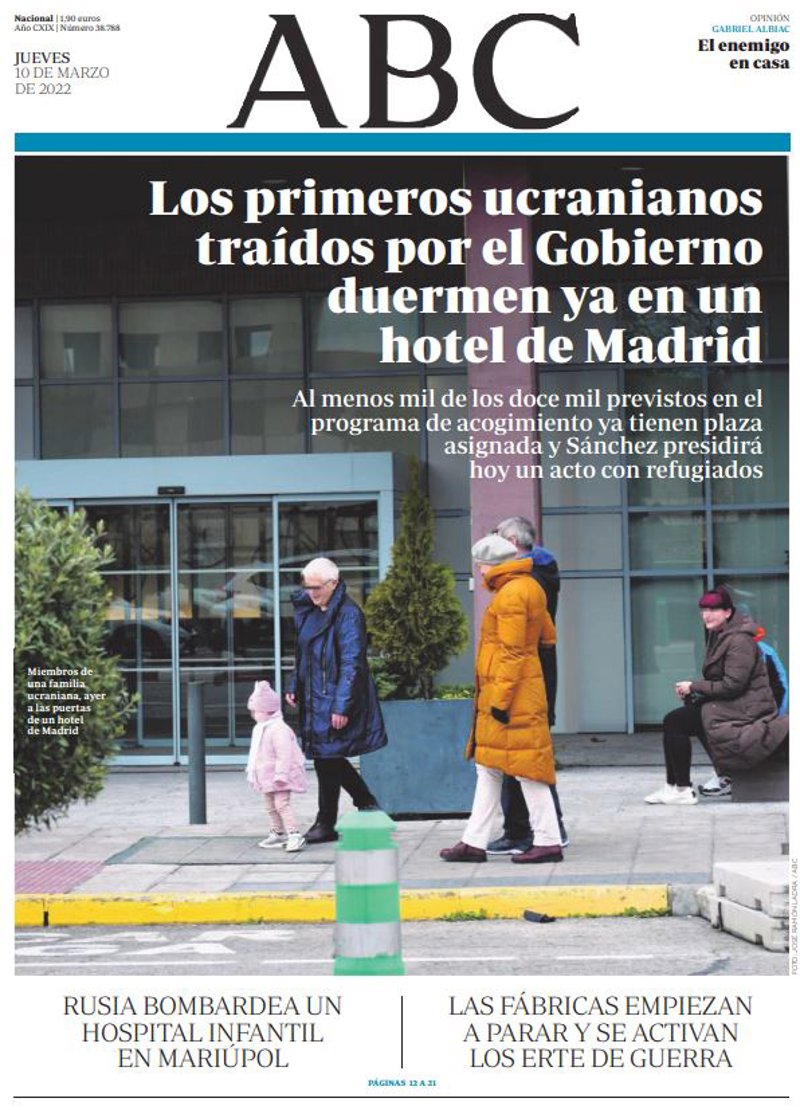 ABC: "Los primeros ucranianos traídos por el Gobierno duermen ya en un hotel de Madrid. Al menos mil de los doce mil previstos en el programa de acogimiento ya tienen plaza asignada y Sánchez presidirá hoy un acto con refugiados"; "Rusia bombardea un hospital infantil en Mariúpol"; "Las fábricas empiezan a parar y se activan los erte de guerra".