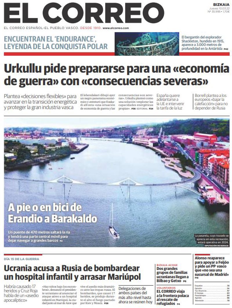 EL CORREO: "Urkullu pide prepararse para una "economía de guerra" con "consecuencias severas""; "A pie o en bici de Erandio a Barakaldo"; "Ucrania acusa a Rusia de bombardear un hospital infantil y arrasar Mariúpo"; "Alonso reaparece para apoyar a Feijóo y pide un PP vasco que "no sea una sucursal de Madrid"".
