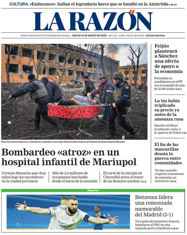 LA RAZÓN: "Bombardeo "atroz" en un hospital infantil de Mariupol"; "Feijóo planteará a Sánchez una oferta de apoyo a la economía"; "La luz había triplicado su precio ya antes de la amenaza rusa"; "El fin de las mascarillas desata la guerra entre comunidades".