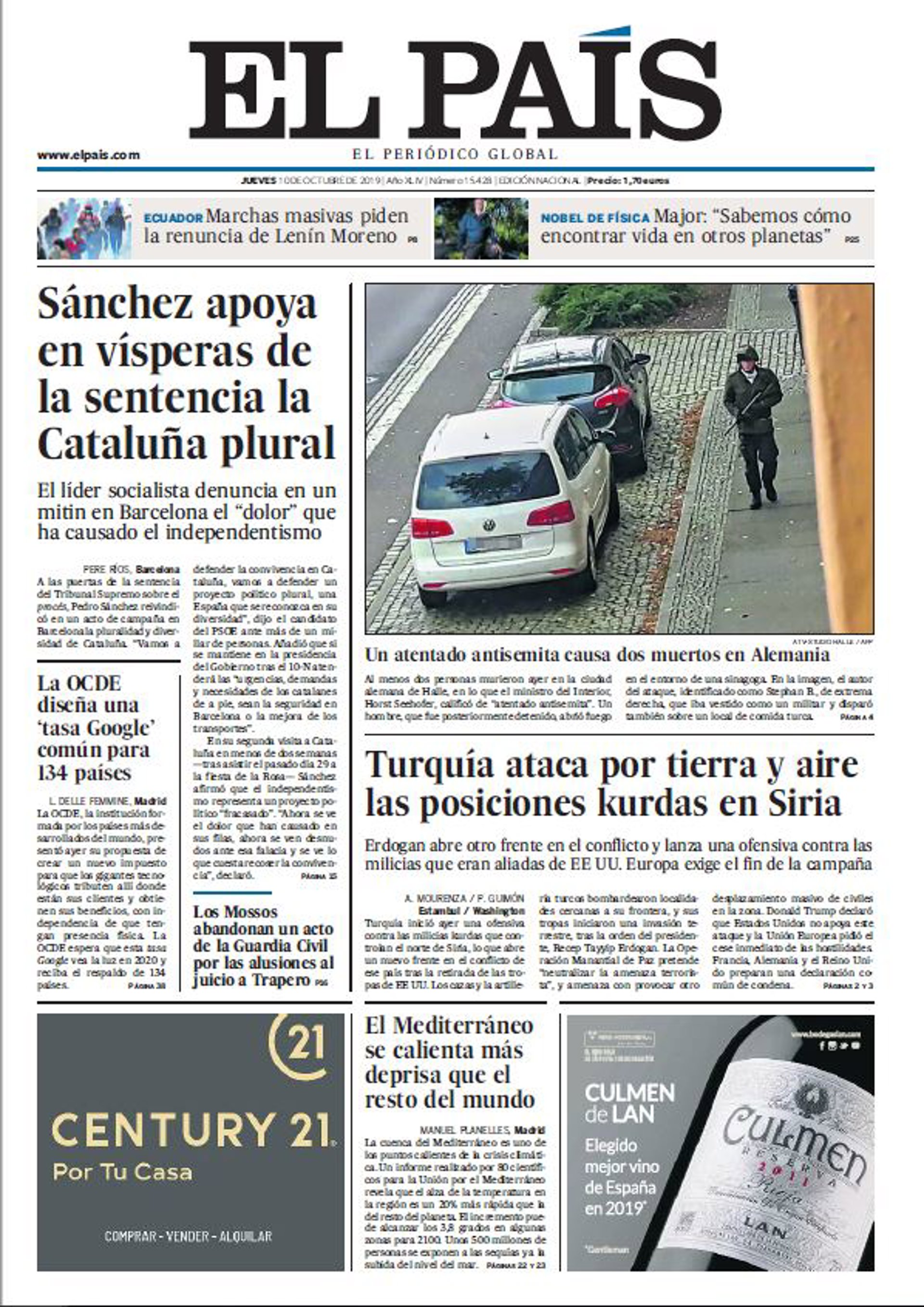 EL PAÍS: "Sánchez apoya en vísperas de la sentencia la Cataluña plural"; "Un atentado antisemita causa dos muertos en Alemania"; "Turquía ataca por tierra y aire las posiciones kurdas en Siria"; "El Mediterráneo se calienta más deprisa que el resto del mundo"; "La OCDE diseña una 'tasa Google' común para 134 países".